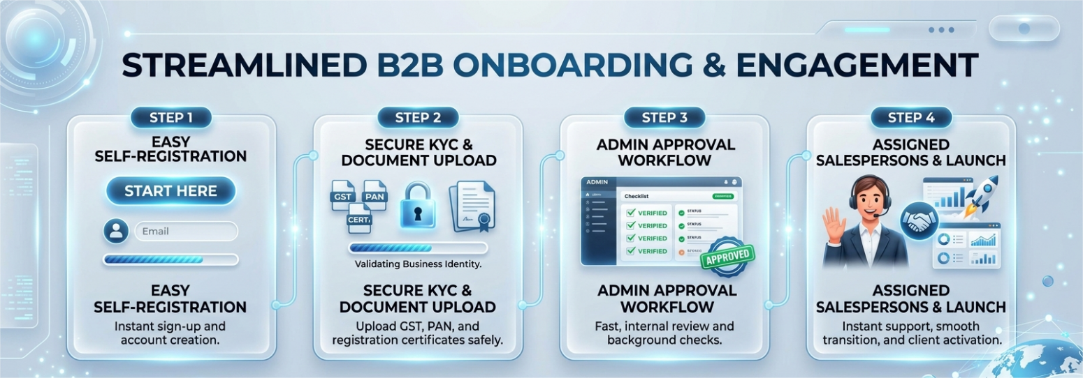 Assign salespersons immediately after approval to ensure personalized attention and stronger engagement. This end-to-end onboarding solution helps reduce friction, improve client satisfaction, and sets the stage for faster conversions and long-term B2B relationships.