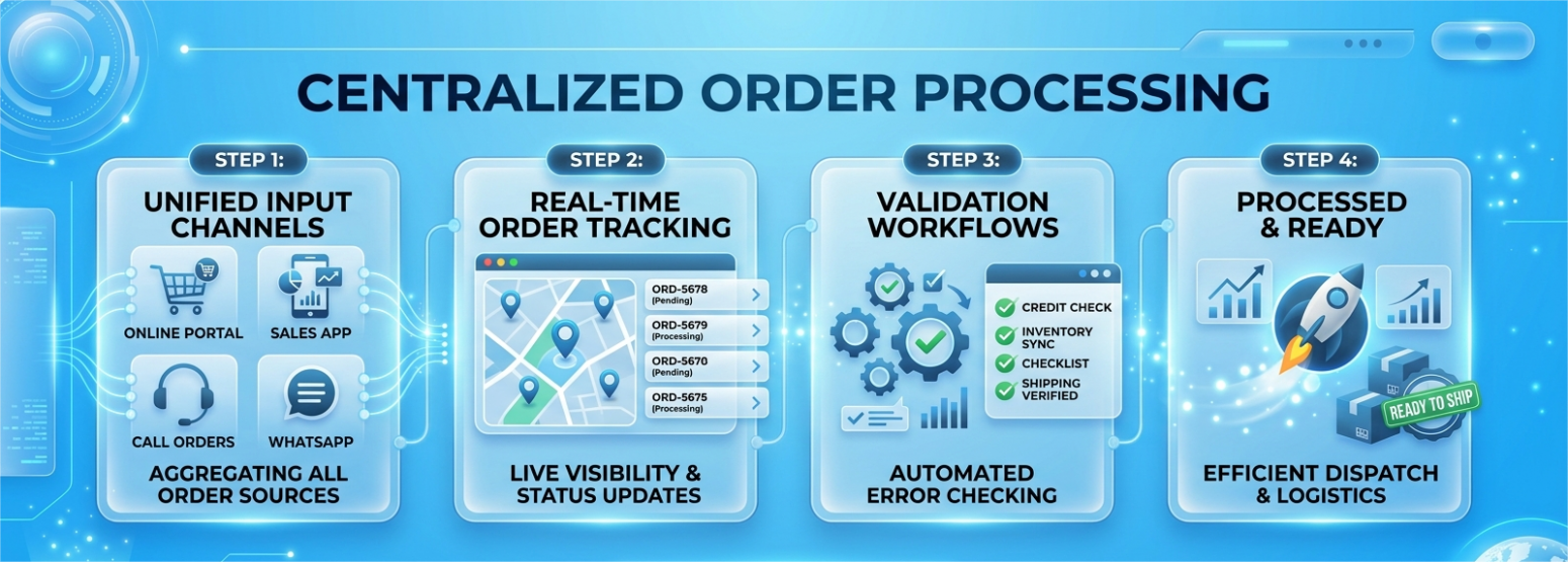 Our Centralized Order Processing system is designed to unify all your B2B order channels, creating a seamless workflow for managing orders from multiple sources. Whether orders come through your online portal, salesperson app, call orders, or WhatsApp, everything is consolidated into a single, organized system.