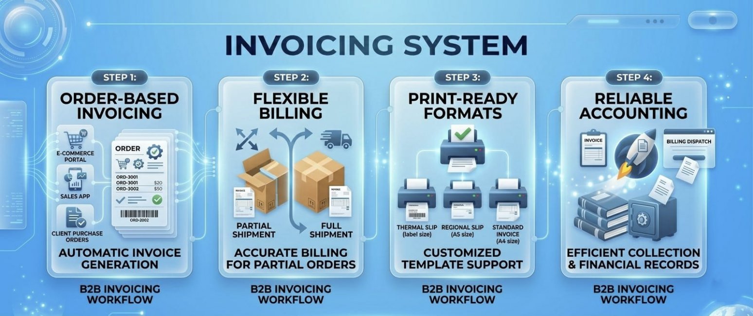 With support for Thermal, Slip, and A4 formats, the platform adapts to diverse operational needs and printer types. This structured approach improves speed, accuracy, and overall financial management, making it easier for your business to handle high volumes of invoices without errors or delays.
